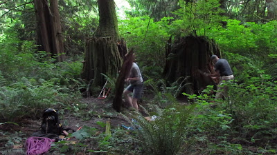 "A" and I come up in the evening. She has had an art installation out in the forest for about 2 years - several old law books, carved and sealed in wax, but with a couple fungi types introduced to the pages. They were mounted on the sides of old growth cedar nurse stumps. We're collecting them to be shown back in the city. I had suggested that we split out part of the stumps, so we come armed with a saw, axe and some rope.